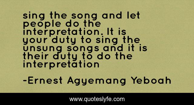 This page presents the quote "sing the song and let people do the interpretation. It is your duty to sing the unsung songs and it is their duty to do the interpretation". Author of this quote is Ernest Agyemang Yeboah. This quote is about be-assertive, make-it-happen, count-and-be-counted, be-who-you-are, challenges, stay-focused, just-do-it, know-who-you-are, gossip,.