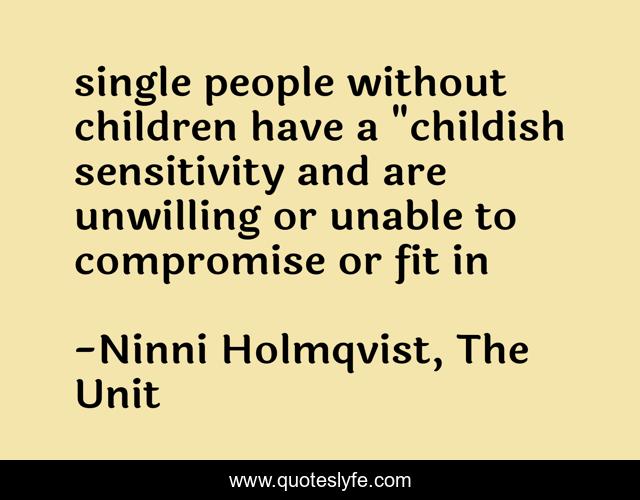 This page presents the quote "single people without children have a "childish sensitivity and are unwilling or unable to compromise or fit in". Author of this quote is Ninni Holmqvist, The Unit. This quote is about personality-types, self-discovery,.