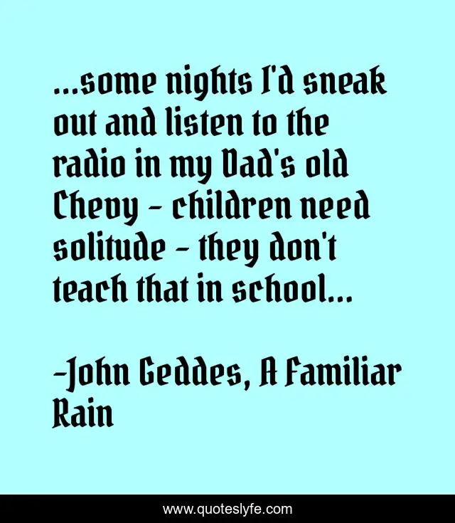 This page presents the quote "...some nights I'd sneak out and listen to the radio in my Dad's old Chevy - children need solitude - they don't teach that in school...". Author of this quote is John Geddes, A Familiar Rain. This quote is about dad, solitutde, schooling, wisdom, old-chevy, radio, teach, childhood-memories,.