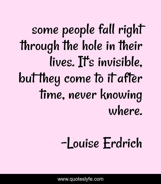This page presents the quote "some people fall right through the hole in their lives. It's invisible, but they come to it after time, never knowing where.". Author of this quote is Louise Erdrich. This quote is about hole, fall, life, people,.