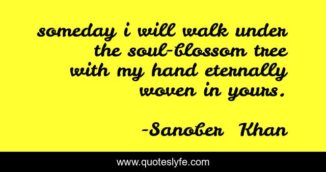 This page presents the quote "someday i will walk under the soul-blossom tree with my hand eternally woven in yours.". Author of this quote is Sanober Khan. This quote is about eternity, poets, love, eternal, soulmates, poetry, trees, romance, walking,.