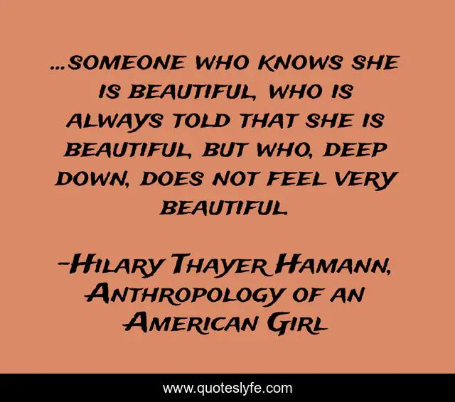 This page presents the quote "...someone who knows she is beautiful, who is always told that she is beautiful, but who, deep down, does not feel very beautiful.". Author of this quote is Hilary Thayer Hamann, Anthropology of an American Girl. This quote is about insecurity, beauty,.