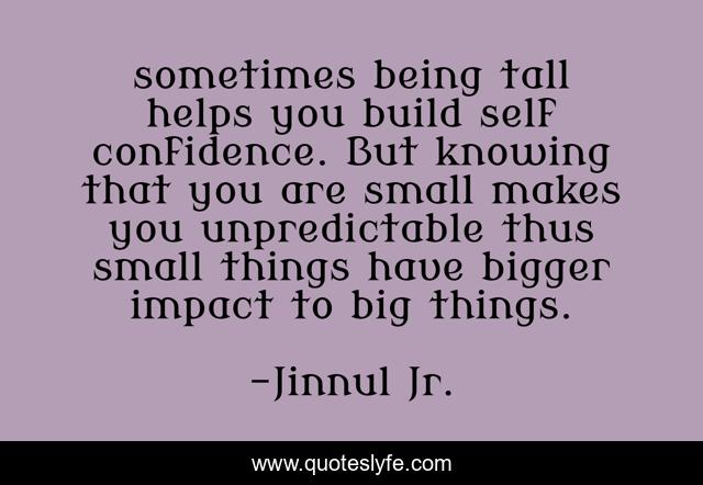 This page presents the quote "sometimes being tall helps you build self confidence. But knowing that you are small makes you unpredictable thus small things have bigger impact to big things.". Author of this quote is Jinnul Jr.. This quote is about impact, confidence, big, little, tiny, unpredictable, build, small, tall,.