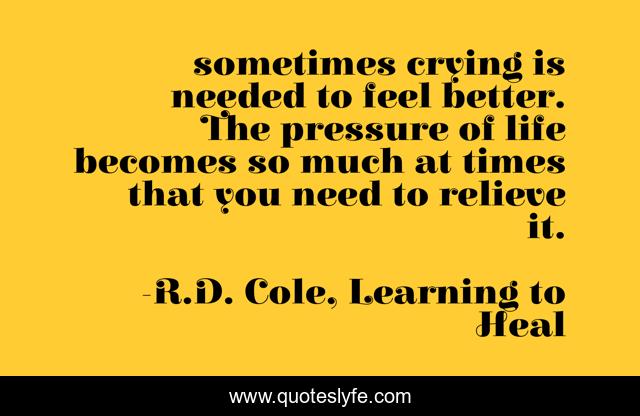 This page presents the quote "sometimes crying is needed to feel better. The pressure of life becomes so much at times that you need to relieve it.". Author of this quote is R.D. Cole, Learning to Heal. This quote is about getting-better, crying,.