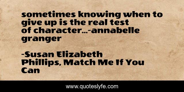 This page presents the quote "sometimes knowing when to give up is the real test of character...-annabelle granger". Author of this quote is Susan Elizabeth Phillips, Match Me If You Can. .