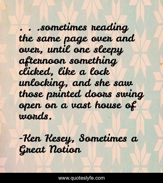 This page presents the quote ". . .sometimes reading the same page over and over, until one sleepy afternoon something clicked, like a lock unlocking, and she saw those printed doors swing open on a vast house of words.". Author of this quote is Ken Kesey, Sometimes a Great Notion. .
