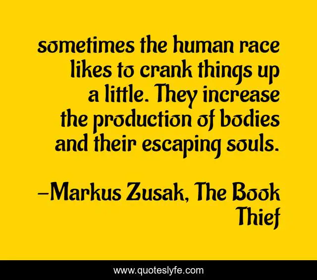 This page presents the quote "sometimes the human race likes to crank things up a little. They increase the production of bodies and their escaping souls.". Author of this quote is Markus Zusak, The Book Thief. This quote is about human-nature, death,.