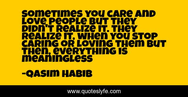 This page presents the quote "sometimes you care and love people but they didn't realize it. they realize it, when you stop caring or loving them but then, everything is meaningless". Author of this quote is Qasim Habib. This quote is about effection, love, inspirational, enthusiasm, affection, care,.