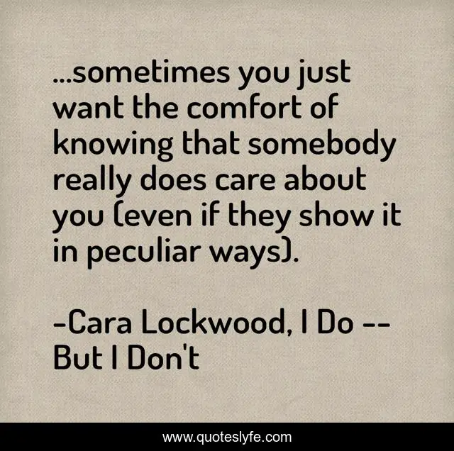 This page presents the quote "...sometimes you just want the comfort of knowing that somebody really does care about you (even if they show it in peculiar ways).". Author of this quote is Cara Lockwood, I Do -- But I Don't. This quote is about comfort, love, affection,.