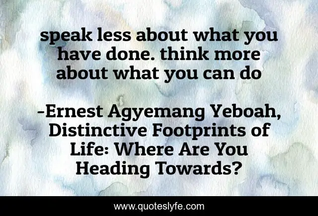 This page presents the quote "speak less about what you have done. think more about what you can do". Author of this quote is Ernest Agyemang Yeboah, Distinctive Footprints of Life: Where Are You Heading Towards?. This quote is about life, inspirational, deeds, wisdom, life-lessons, enthusiasm,.