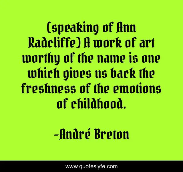 This page presents the quote "(speaking of Ann Radcliffe) A work of art worthy of the name is one which gives us back the freshness of the emotions of childhood.". Author of this quote is André Breton. This quote is about art, radcliffe, gothic, childhood, imagination,.