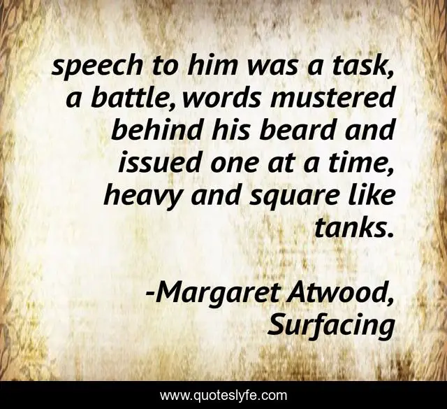 This page presents the quote "speech to him was a task, a battle, words mustered behind his beard and issued one at a time, heavy and square like tanks.". Author of this quote is Margaret Atwood, Surfacing. This quote is about speech, words,.