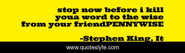 This page presents the quote "stop now before i kill youa word to the wise from your friendPENNYWISE". Author of this quote is Stephen King, It. This quote is about stephen-king, horror, kids, it, pennywise,.