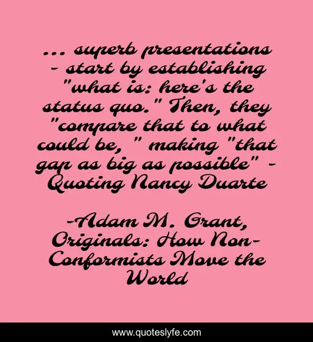 This page presents the quote "... superb presentations - start by establishing "what is: here's the status quo." Then, they "compare that to what could be, " making "that gap as big as possible" - Quoting Nancy Duarte". Author of this quote is Adam M. Grant, Originals: How Non-Conformists Move the World. This quote is about motivation, presentation, persuation,.
