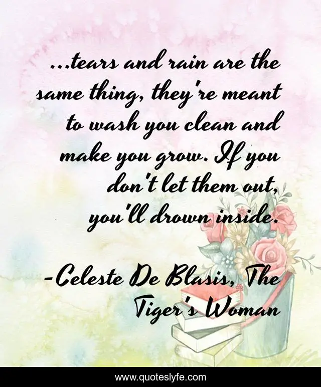 This page presents the quote "...tears and rain are the same thing, they're meant to wash you clean and make you grow. If you don't let them out, you'll drown inside.". Author of this quote is Celeste De Blasis, The Tiger's Woman. This quote is about growing, tears, rain,.