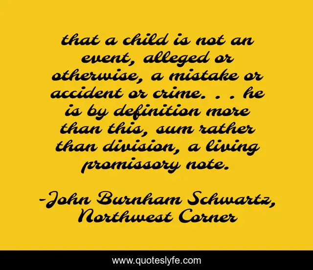 This page presents the quote "that a child is not an event, alleged or otherwise, a mistake or accident or crime. . . he is by definition more than this, sum rather than division, a living promissory note.". Author of this quote is John Burnham Schwartz, Northwest Corner. This quote is about parenting, growth, love, children, affection,.