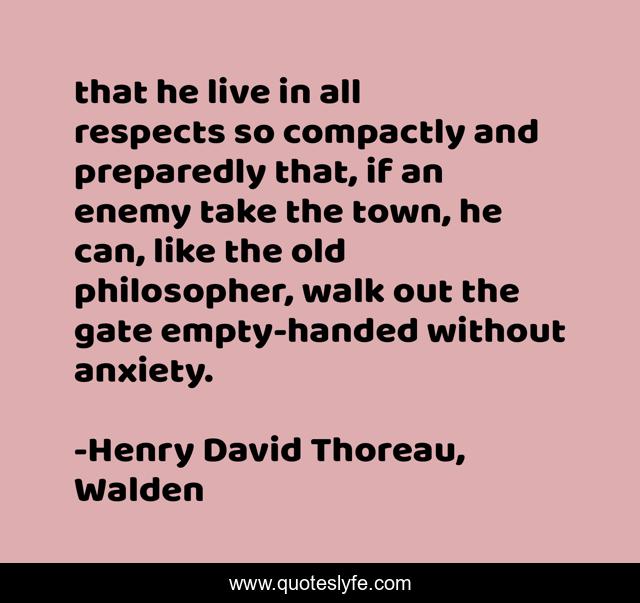 This page presents the quote "that he live in all respects so compactly and preparedly that, if an enemy take the town, he can, like the old philosopher, walk out the gate empty-handed without anxiety.". Author of this quote is Henry David Thoreau, Walden. This quote is about simplicity, anxiety,.