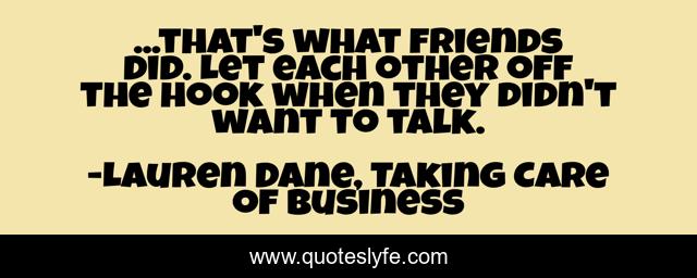 This page presents the quote "...that's what friends did. Let each other off the hook when they didn't want to talk.". Author of this quote is Lauren Dane, Taking Care of Business. This quote is about talking, friends,.