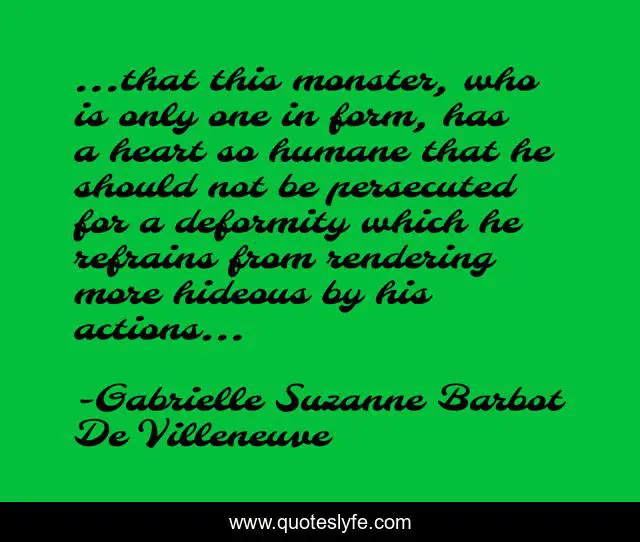 This page presents the quote "...that this monster, who is only one in form, has a heart so humane that he should not be persecuted for a deformity which he refrains from rendering more hideous by his actions...". Author of this quote is Gabrielle Suzanne Barbot De Villeneuve. This quote is about enthusiasm, deep, inspirational, pensive,.