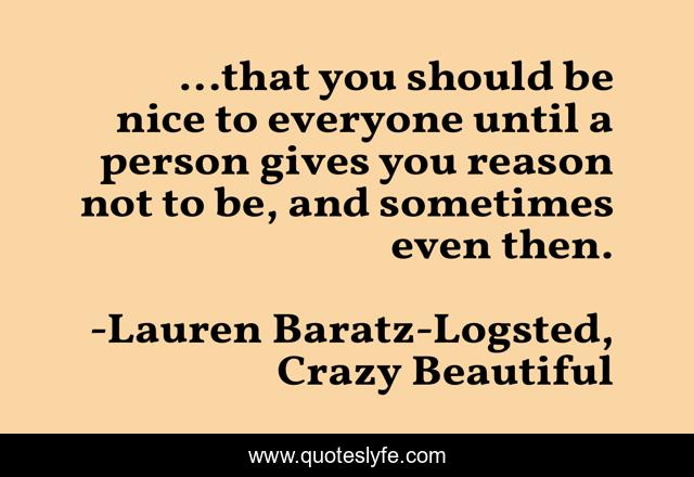 This page presents the quote "...that you should be nice to everyone until a person gives you reason not to be, and sometimes even then.". Author of this quote is Lauren Baratz-Logsted, Crazy Beautiful. This quote is about life, kindness,.