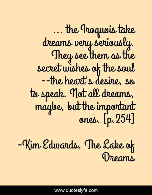 This page presents the quote "... the Iroquois take dreams very seriously. They see them as the secret wishes of the soul--the heart's desire, so to speak. Not all dreams, maybe, but the important ones. [p.254]". Author of this quote is Kim Edwards, The Lake of Dreams. .