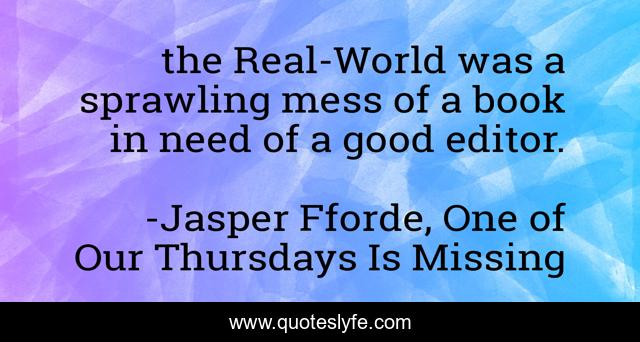 This page presents the quote "the Real-World was a sprawling mess of a book in need of a good editor.". Author of this quote is Jasper Fforde, One of Our Thursdays Is Missing. This quote is about life, books, humor, reading, philosophy,.