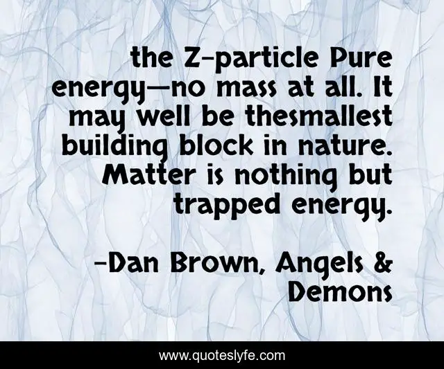 "Dan Brown, Angels & Demons Quotes." Quoteslyfe.com, 2025. Sat. 06 Dec. 2025. <https://www.quoteslyfe.com/quote/the-Z-particle-Pure-energy-no-mass-216429>.