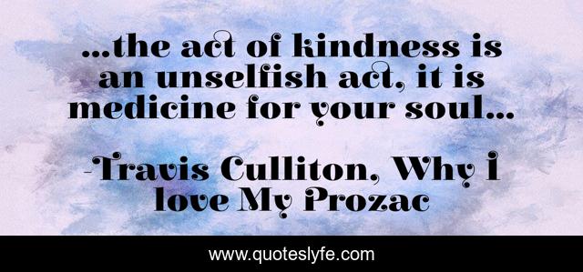 This page presents the quote "...the act of kindness is an unselfish act, it is medicine for your soul...". Author of this quote is Travis Culliton, Why I love My Prozac. This quote is about living, life, kindness, kindness-compassion, living-well, living-life, goodness, living-life-to-the-fullest, altruism,.