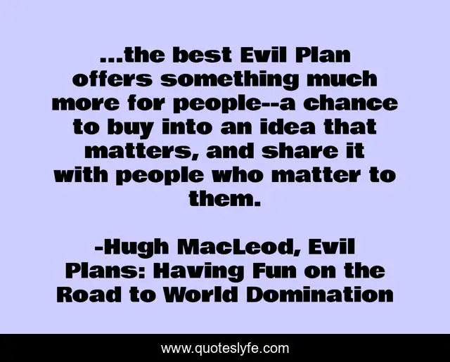 This page presents the quote "...the best Evil Plan offers something much more for people--a chance to buy into an idea that matters, and share it with people who matter to them.". Author of this quote is Hugh MacLeod, Evil Plans: Having Fun on the Road to World Domination. This quote is about inspirational-attitude, enthusiasm, inspiring, hope, inspirational,.