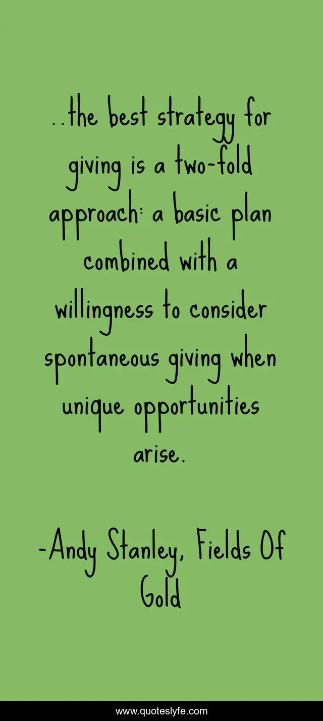 This page presents the quote "..the best strategy for giving is a two-fold approach: a basic plan combined with a willingness to consider spontaneous giving when unique opportunities arise.". Author of this quote is Andy Stanley, Fields Of Gold. This quote is about giving, financial-planning, opportunity, stewardship, strategy,.