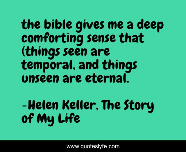 This page presents the quote "the bible gives me a deep comforting sense that (things seen are temporal, and things unseen are eternal.". Author of this quote is Helen Keller, The Story of My Life. This quote is about blindness, temporal, bible, eternal, sight,.