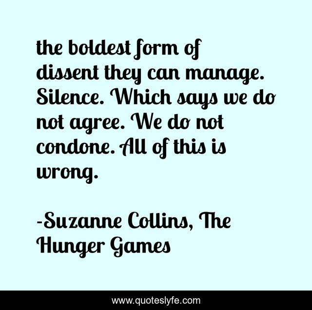 This page presents the quote "the boldest form of dissent they can manage. Silence. Which says we do not agree. We do not condone. All of this is wrong.". Author of this quote is Suzanne Collins, The Hunger Games. This quote is about the-hunger-games, silence, the-reaping,.