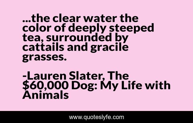 This page presents the quote "...the clear water the color of deeply steeped tea, surrounded by cattails and gracile grasses.". Author of this quote is Lauren Slater, The $60,000 Dog: My Life with Animals. This quote is about memoir, identity,.