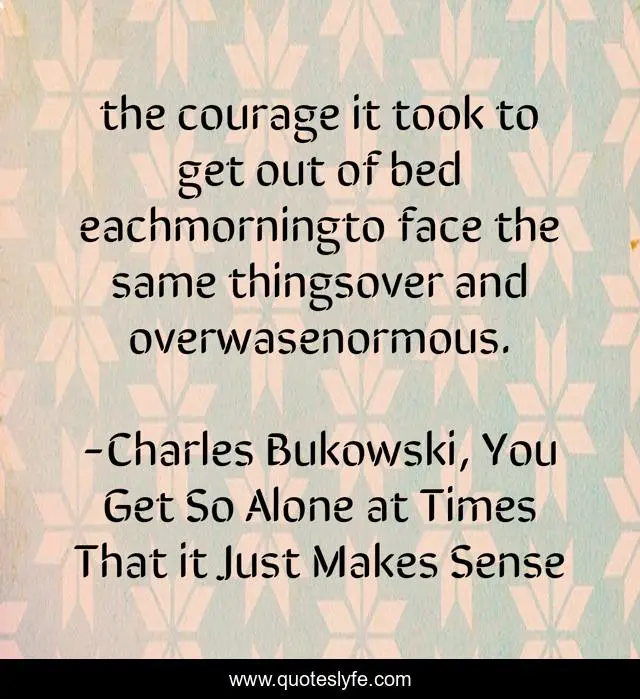 This page presents the quote "the courage it took to get out of bed eachmorningto face the same thingsover and overwasenormous.". Author of this quote is Charles Bukowski, You Get So Alone at Times That it Just Makes Sense. .