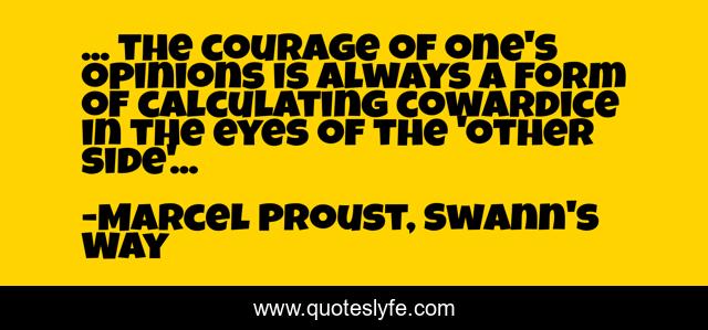 This page presents the quote "... the courage of one's opinions is always a form of calculating cowardice in the eyes of the 'other side'...". Author of this quote is Marcel Proust, Swann's Way. This quote is about cowardice, opinions, courage,.