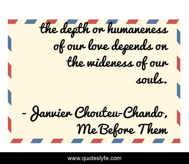 This page presents the quote "the depth or humaneness of our love depends on the wideness of our souls.". Author of this quote is Janvier Chouteu-Chando, Me Before Them. This quote is about life, love, inspirational, family, positive, motivational, confidence, grief, optimistic,.