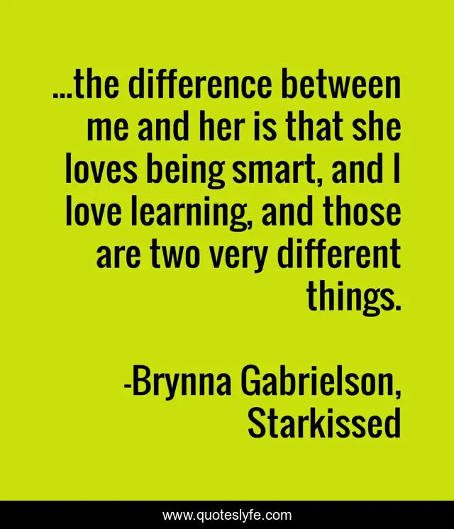 This page presents the quote "...the difference between me and her is that she loves being smart, and I love learning, and those are two very different things.". Author of this quote is Brynna Gabrielson, Starkissed. This quote is about sydney-kane, learning,.