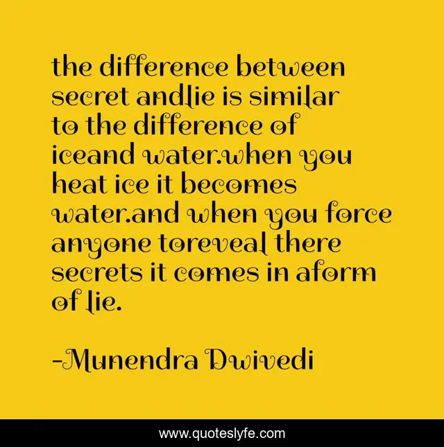 This page presents the quote "the difference between secret andlie is similar to the difference of iceand water.when you heat ice it becomes water.and when you force anyone toreveal there secrets it comes in aform of lie.". Author of this quote is Munendra Dwivedi. This quote is about lie, difference, inspirational, enthusiasm,.