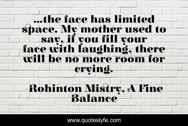 This page presents the quote "...the face has limited space. My mother used to say, if you fill your face with laughing, there will be no more room for crying.". Author of this quote is Rohinton Mistry, A Fine Balance. .