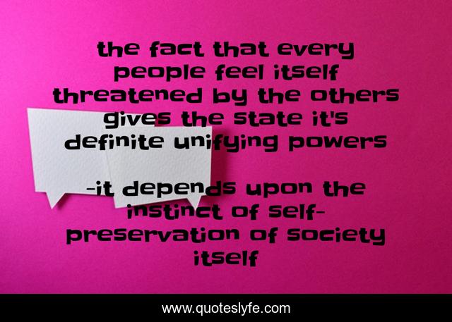 This page presents the quote "the fact that every people feel itself threatened by the others gives the state it's definite unifying powers". Author of this quote is it depends upon the instinct of self-preservation of society itself. .