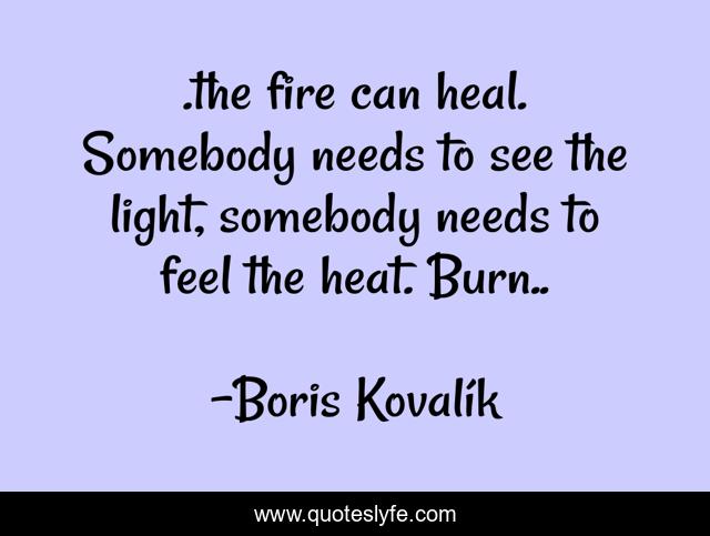 This page presents the quote ".the fire can heal. Somebody needs to see the light, somebody needs to feel the heat. Burn..". Author of this quote is Boris Kovalík. This quote is about peace-of-mind, enthusiasm, inspirational,.
