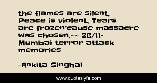 This page presents the quote "the flames are silent, Peace is violent, Tears are frozen’cause massacre was chosen.~~ 26/11– Mumbai terror attack memories". Author of this quote is Ankita Singhal. This quote is about poem, peace, mumbai, violence, poetry, tears, 26-11, terror, terrorism,.
