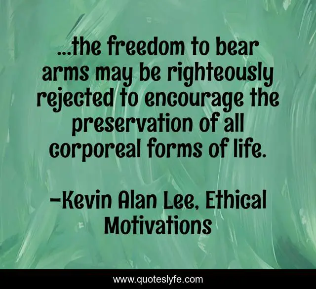 This page presents the quote "...the freedom to bear arms may be righteously rejected to encourage the preservation of all corporeal forms of life.". Author of this quote is Kevin Alan Lee, Ethical Motivations. This quote is about constitution, usa, rights, freedom, gun-control, arms, liberty, weapons, freedoms,.