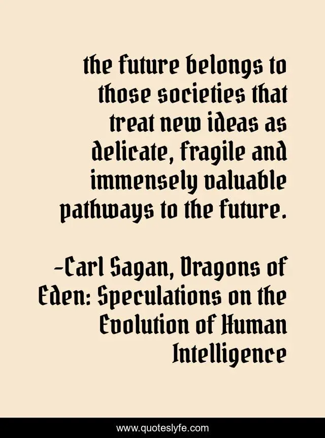 This page presents the quote "the future belongs to those societies that treat new ideas as delicate, fragile and immensely valuable pathways to the future.". Author of this quote is Carl Sagan, Dragons of Eden: Speculations on the Evolution of Human Intelligence. This quote is about intelligence, evolution, future, ideas,.