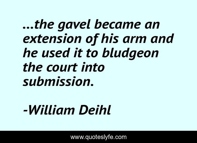 This page presents the quote "…the gavel became an extension of his arm and he used it to bludgeon the court into submission.". Author of this quote is William Deihl. .
