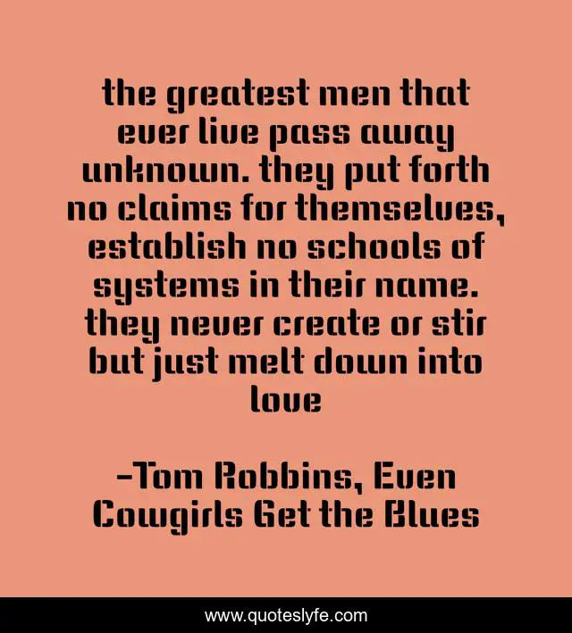 This page presents the quote "the greatest men that ever live pass away unknown. they put forth no claims for themselves, establish no schools of systems in their name. they never create or stir but just melt down into love". Author of this quote is Tom Robbins, Even Cowgirls Get the Blues. .