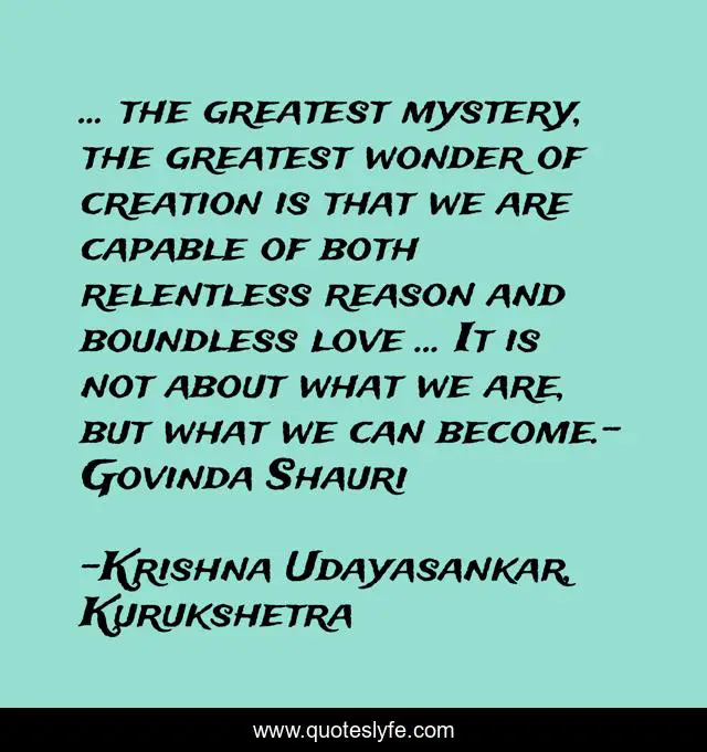 This page presents the quote "… the greatest mystery, the greatest wonder of creation is that we are capable of both relentless reason and boundless love ... It is not about what we are, but what we can become.– Govinda Shauri". Author of this quote is Krishna Udayasankar, Kurukshetra. This quote is about fiction, strategy, indian, mythology, war, nobility,.