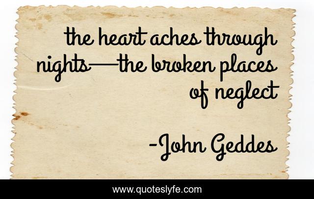 This page presents the quote "the heart aches through nights—the broken places of neglect". Author of this quote is John Geddes. This quote is about grief, loss, unrequited,.