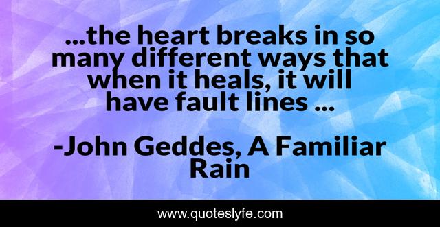 This page presents the quote "...the heart breaks in so many different ways that when it heals, it will have fault lines ...". Author of this quote is John Geddes, A Familiar Rain. This quote is about heart, fault-lines, breaks, heartbreak, heals, inspiration,.