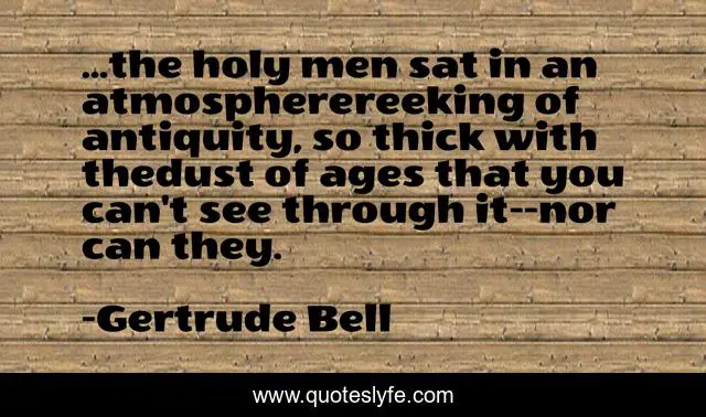 This page presents the quote "...the holy men sat in an atmospherereeking of antiquity, so thick with thedust of ages that you can't see through it--nor can they.". Author of this quote is Gertrude Bell. This quote is about history, wisdom,.